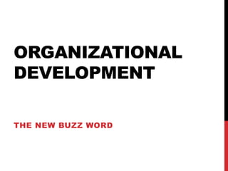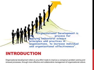 Organizational development refers to planned efforts to improve an organization's problem-solving and ability to change through effective management of culture. It aims to change culture and reinforce strategies, structures, and processes to improve effectiveness. Organizational development applies behavioral science knowledge to entire systems within an organization and targets long-term adoption of new activities. In India, organizational development started in the 1960s through training programs and has evolved with contributions from multinationals, western education, and organizations. It is now a broader field understanding organizations, leadership, and performance through systems thinking.