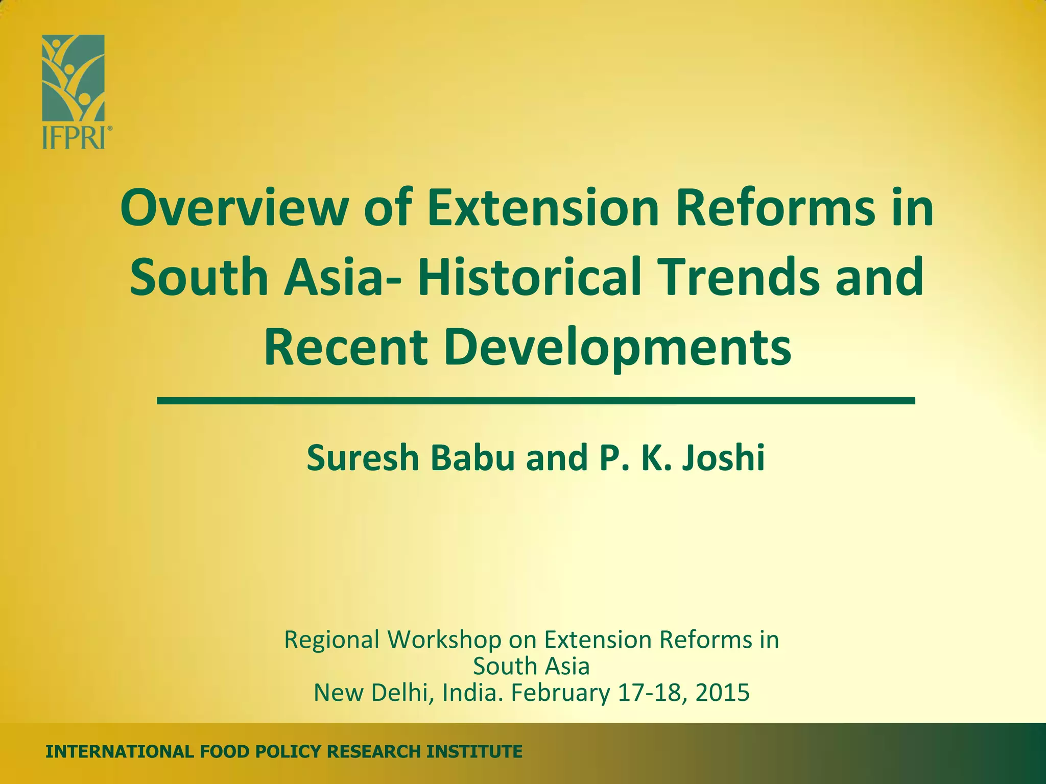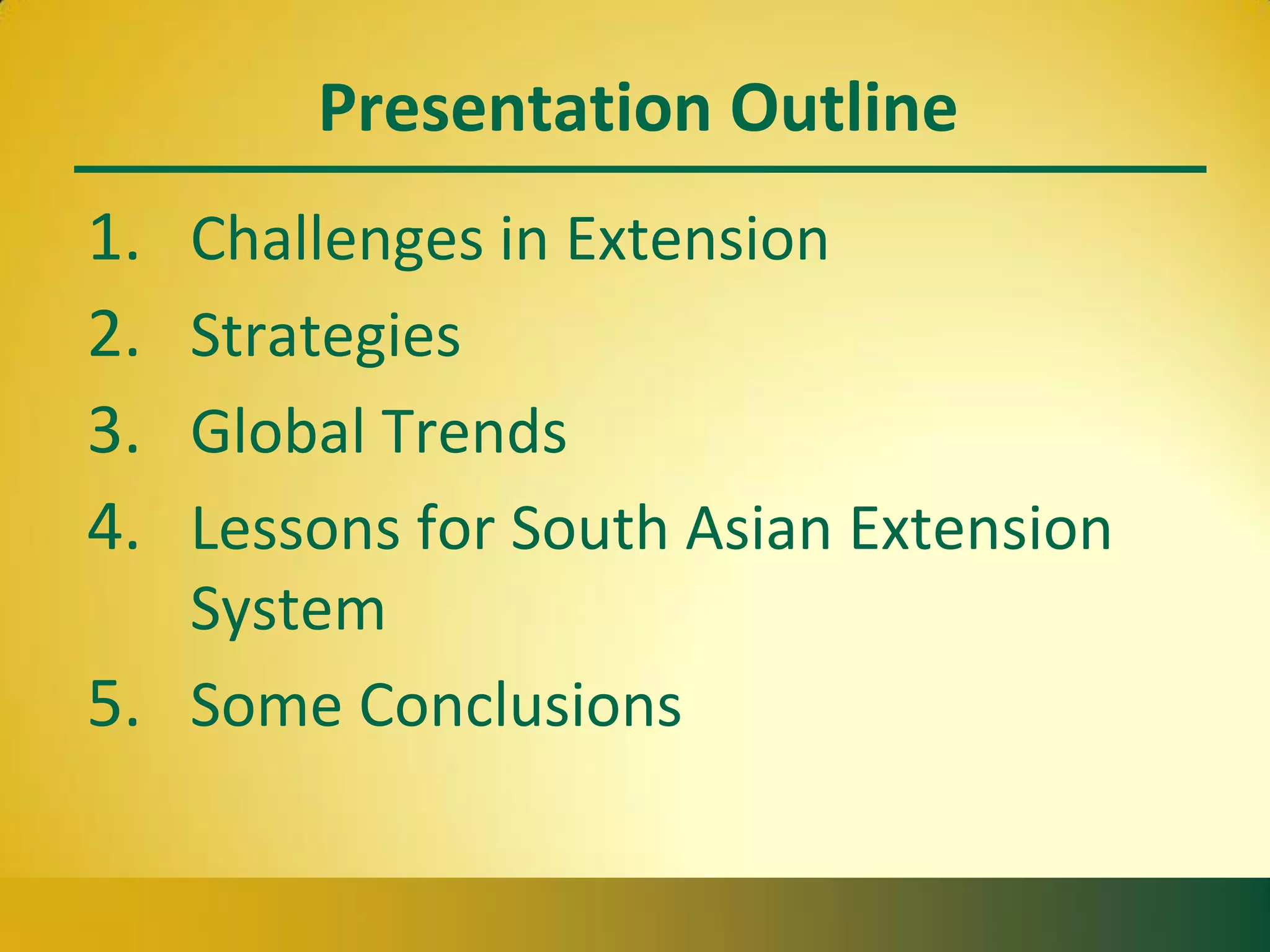 The document discusses the challenges and strategies related to extension reforms in South Asia, highlighting issues within public sector extension and the benefits of privatization and decentralization. It emphasizes the need for broader extension functions and participatory approaches to enhance accountability and empower farmers. Key lessons for South Asian extension systems include the importance of linking research and extension, addressing gender considerations, and fostering collaboration among stakeholders.