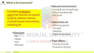 The document discusses environmental studies and disaster management. It begins by defining the environment as complete ecological units including natural and living things that interact with climate, weather, natural resources and affect human survival. It then lists some environmental challenges like pollution, species extinction, deforestation and population growth. The document continues by outlining foundational principles for a circular economy including keeping products and materials in use, regenerating natural systems, and designing out waste and pollution. It provides examples of global water usage and the water footprint of various products. The effects of groundwater depletion and ways to reduce water stress are presented. Key concepts around ecosystems, ecosystem services, wetlands and their benefits are defined. Areas of critical importance for humanity like health, poverty