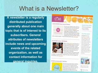 The document discusses newsletters, their purpose, structure, and best practices for creating effective newsletters. A newsletter is a regularly distributed publication about a main topic of interest to subscribers. The key elements of a newsletter include the email subject, headline, content, links, and calls to action. Newsletters should be concise, relevant to the audience, and aim to get their attention, trigger actions, market products or events, and inform or educate readers. Analytics can then measure a newsletter's effectiveness to help improve future newsletters.