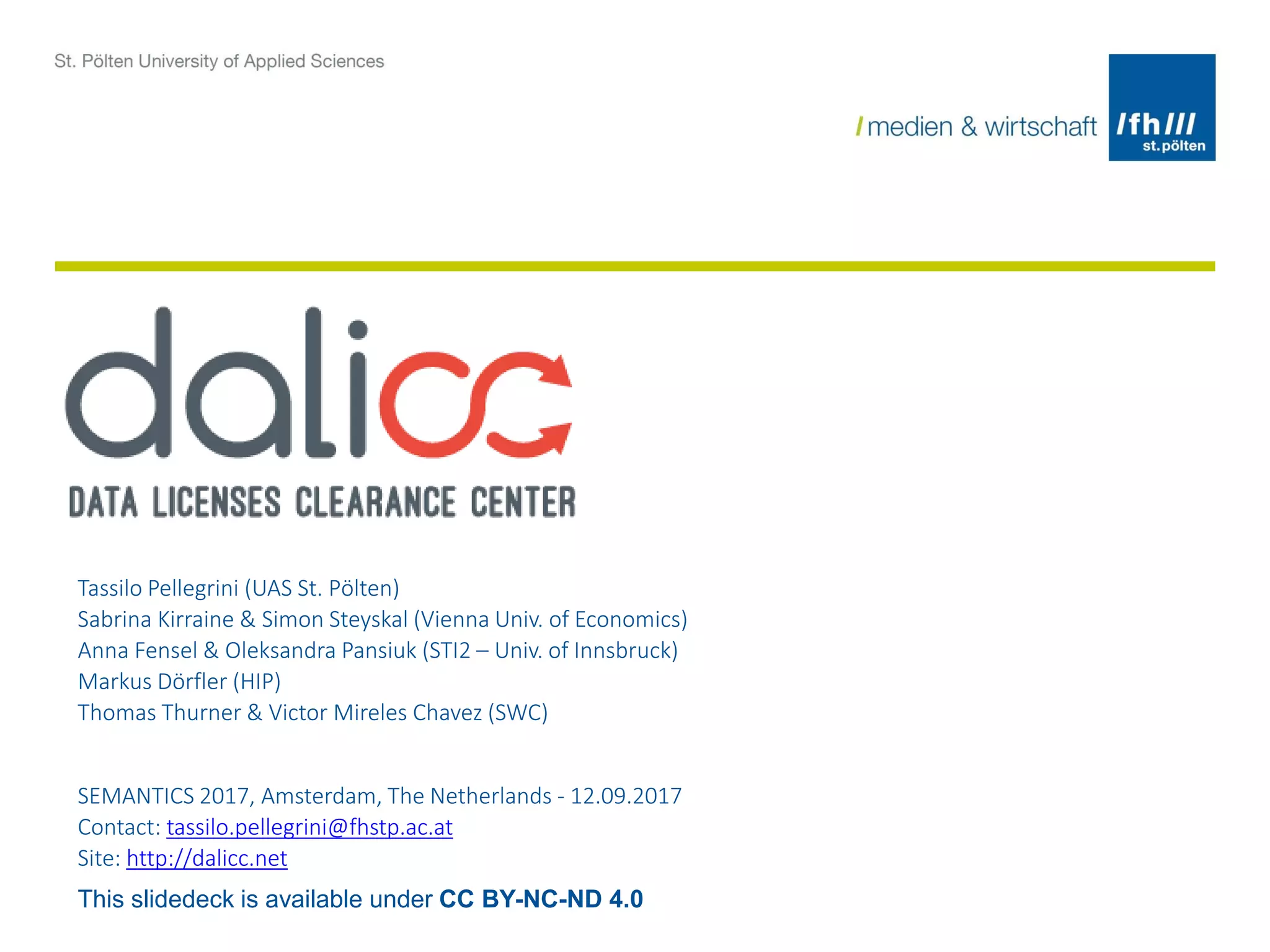 The document summarizes the DALICC (Data Licenses Clearance Center) project. The project aims to develop a software framework that reduces the costs of clearing licenses for derivative works by providing tools to choose licenses, check compatibility, and resolve conflicts. It will represent licenses in RDF and use rules and semantics to reason about licenses and detect inconsistencies. The framework will include components for composing, annotating, and negotiating licenses through a license library and API. The goal is to increase productivity and reuse of data by easing license clearance.