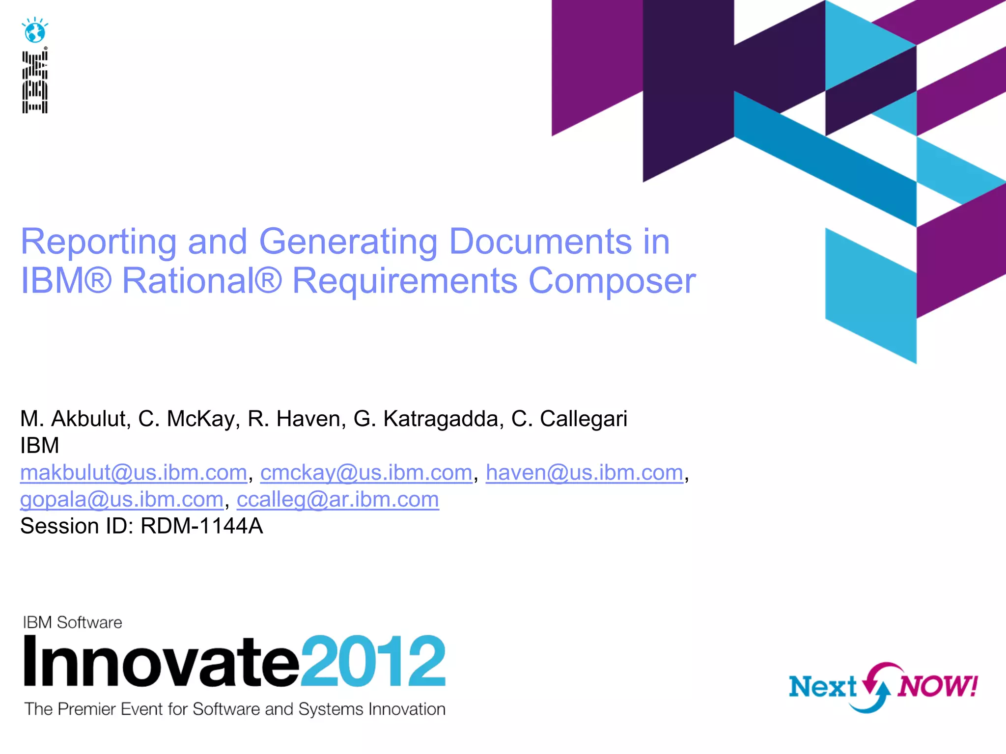 The document discusses reporting in IBM Rational Requirements Composer, including Rational Reporting for Document Generation (RRDG) and Rational Reporting for Document Intelligence (RRDI). It provides an overview of reporting and the reporting architecture. The presentation covers how to create customized reports with RRDG and RRDI, best practices for document and report generation, and examples of real-world reporting.