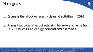 The document discusses the impacts of COVID-19 on energy demand and its potential implications for long-term climate mitigation. It outlines the goals of estimating energy demand shocks, assessing behavioral changes, and performing climate simulations. The findings suggest that while demand changes due to COVID-19 won't fully achieve climate-stabilizing pathways, they can still lead to significant reductions in energy demand and CO2 emissions by 2025 and 2030.