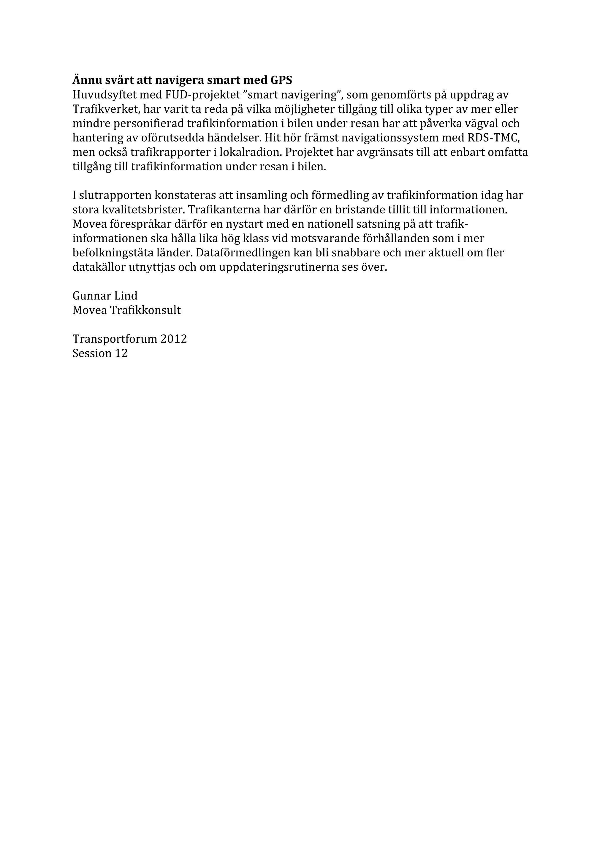 Huvudsyftet med FUD-projektet ”smart navigering”, som genomförts på uppdrag av