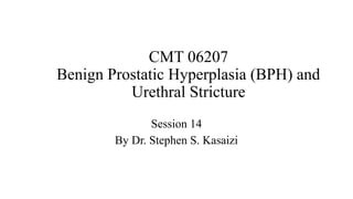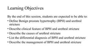 The document provides an overview of benign prostatic hyperplasia (BPH) and urethral stricture, detailing definitions, clinical features, causes, differential diagnoses, and treatment options. BPH is characterized by benign enlargement of the prostate occurring typically between ages 60 and 70, while urethral stricture refers to the narrowing of the urethra, often caused by infections or trauma. Treatment modalities for BPH include medical and surgical options, while urethral stricture may require intermittent dilation or surgery.