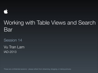 The document provides an overview of table views and search bars in iOS application development. It discusses introducing table views, customizing their appearance, navigating data hierarchies with table views, and manipulating table views by inserting and deleting rows and sections. It also covers introducing search bars, customizing their appearance, and working with search bars in table views by creating search bar scopes and displaying search results in the table view. The document includes code examples and recommends additional Apple documentation references for table views and search bars.