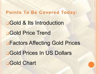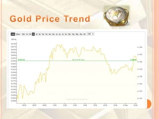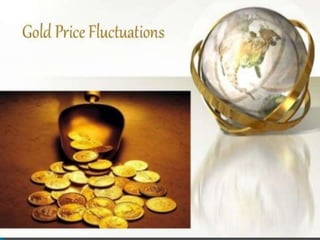 This document discusses factors that affect the price of gold, including global economic crises, inflation, interest rates, and central bank policies. It notes that gold is a finite natural resource, over half of which is used for jewelry. Major consumers of gold include India, China, and the United States. The price of gold fluctuates based on supply and demand dynamics.