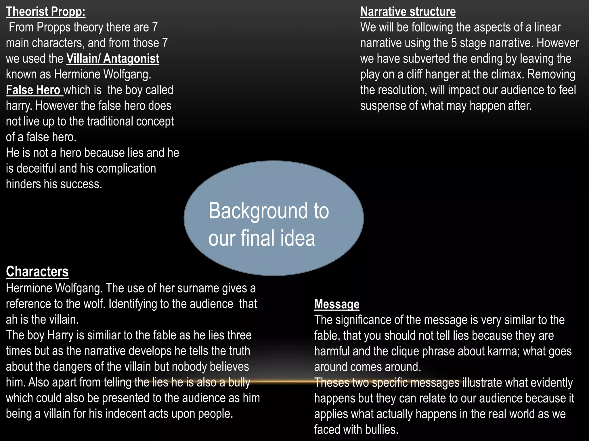 The document summarizes the group's idea for a narrative based on "The Boy Who Cried Wolf" fable. The narrative follows a 5 stage structure but ends in a cliffhanger climax rather than resolution. It introduces the characters of Harry, the lying boy, and Hermione Wolfgang, the villain. The group made changes to simplify the story and add elements of horror and suspense late in the climax instead of throughout. These changes include portraying Harry more negatively and removing a scene of Harry seeing Hermione in the dark corridor.