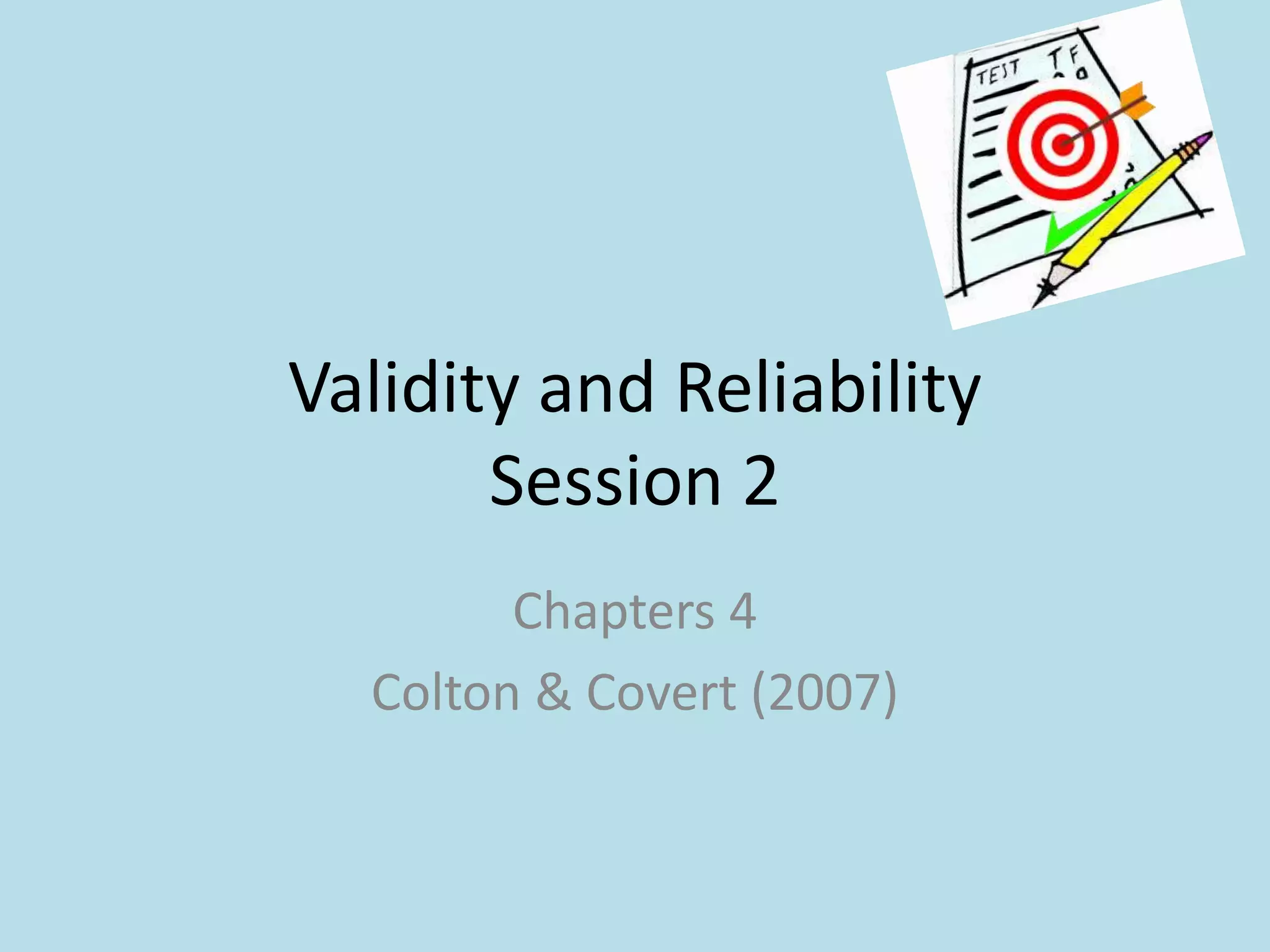 This document discusses validity and reliability in assessment instruments. It defines validity as the ability of an instrument to measure what it intends to measure, and reliability as an instrument's ability to provide consistent results. There are several types of validity discussed, including content validity, construct validity, and criterion validity. Establishing validity involves defining the domain and components being measured, developing items, and expert review. Reliability can be determined through stability, alternate forms, and internal consistency. Statistical analysis is used to calculate reliability coefficients, with 0.80 or higher generally indicating adequate reliability. For an assessment to be useful, it must demonstrate both validity and reliability.