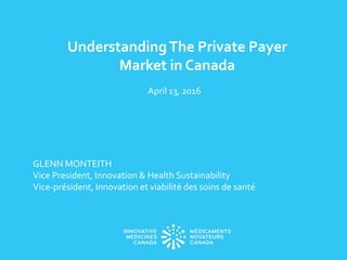 This document discusses the private payer market for prescription drugs in Canada. It provides data on prescription drug spending by payer type across different Canadian regions in 2014. The private market accounts for 22-48% of drug spending across regions. The document also outlines the drug development, review, pricing and reimbursement process in Canada as well as the role of private drug plans and provincial plans. It notes that employer drug plans are important since diseases can impact productivity at work both physically and mentally.