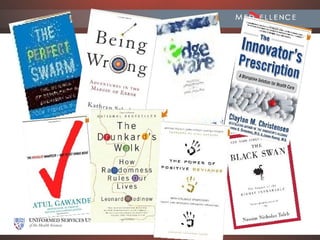 This document discusses complexity science and its implications for decision making in healthcare systems. It contrasts linear, Newtonian thinking with an appreciation of complexity, uncertainty, and positive deviance. Tools are needed to address non-linear situations, such as minimum specifications, wicked questions, and generative relationships. Positive deviance identifies uncommon but successful practices within a community. Variation is unpredictable, and black swan events represent surprises that linear thinking cannot anticipate. A variety of references are provided to further explore these complexity-related concepts.