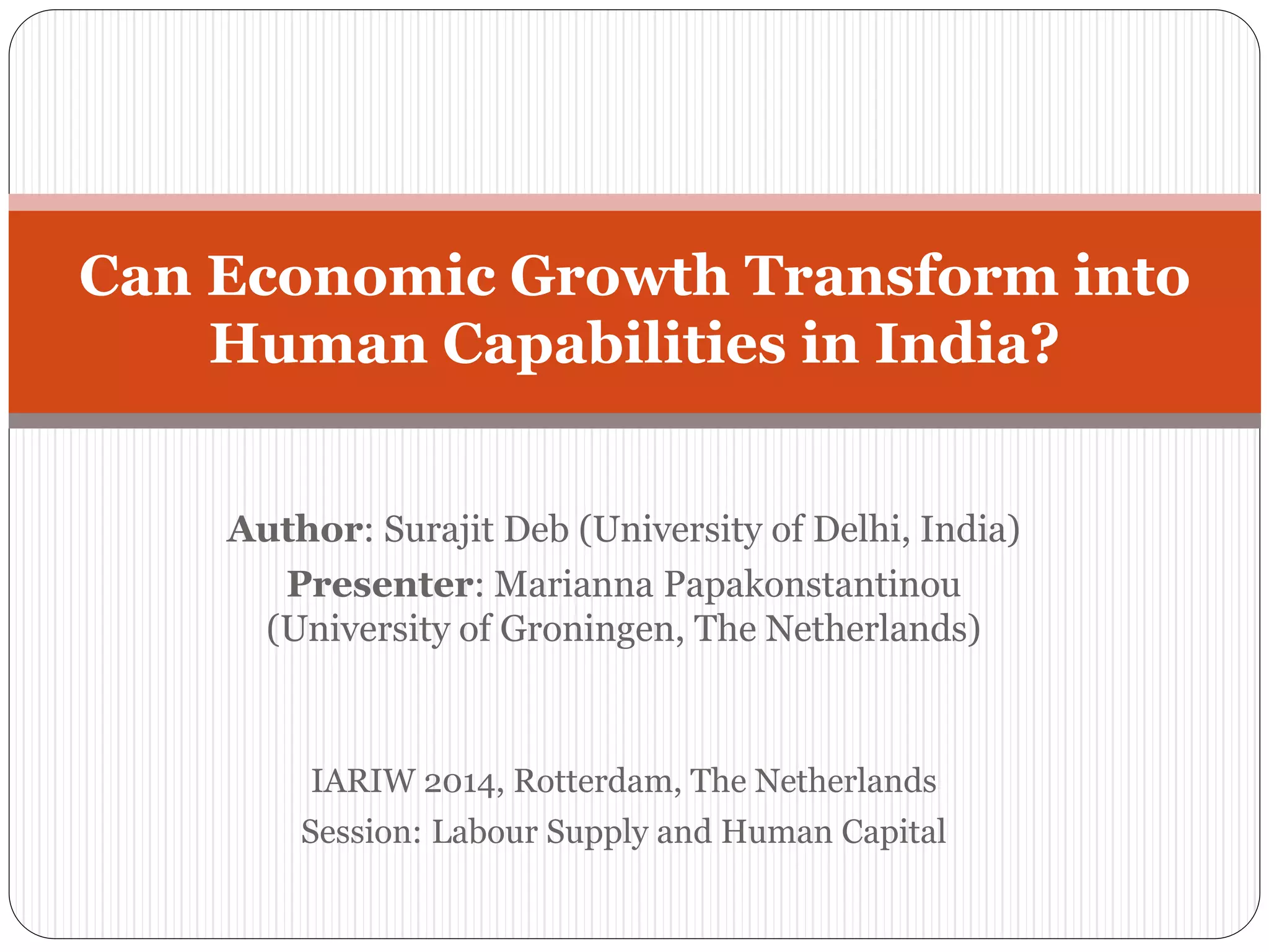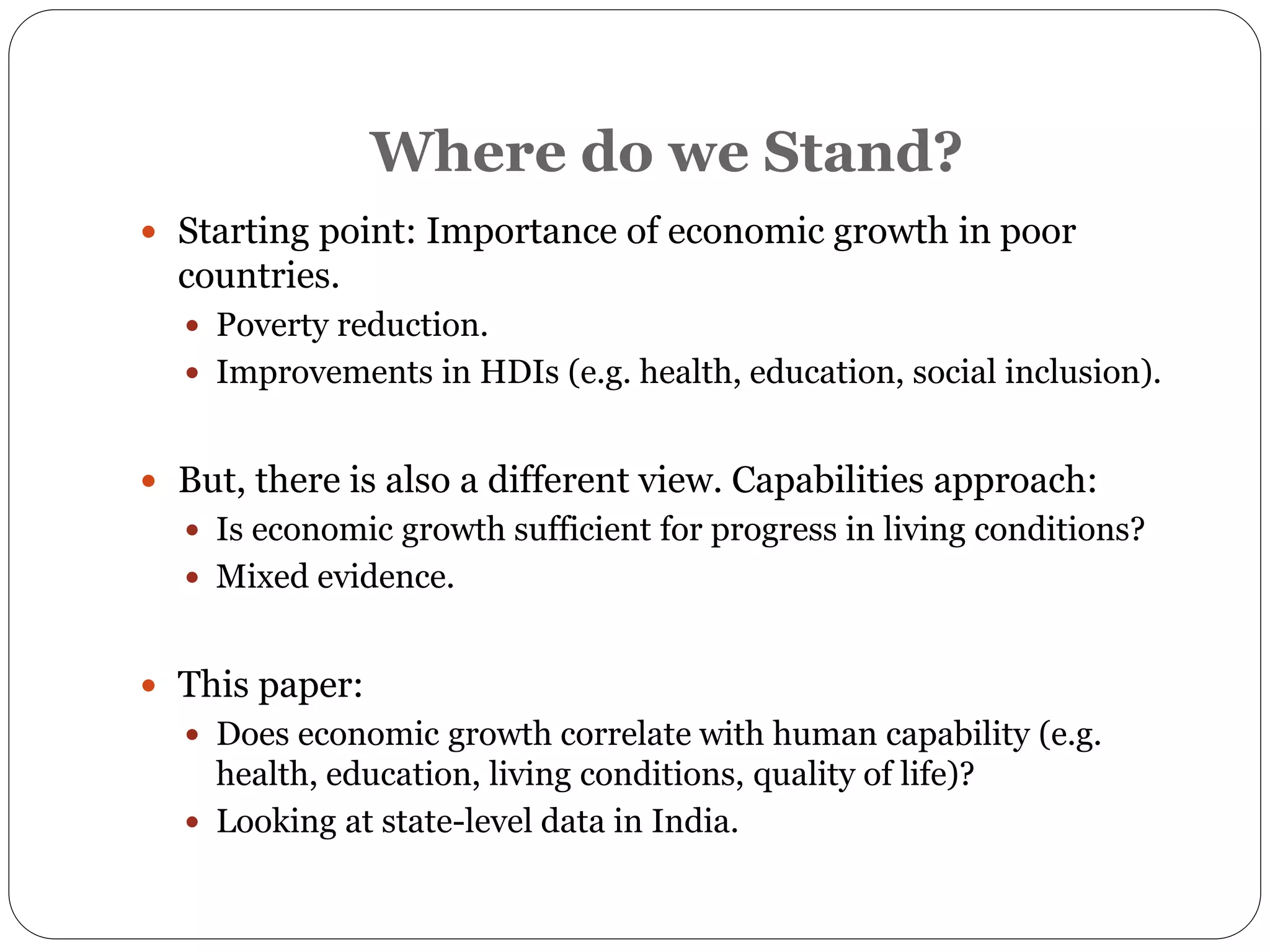 This document summarizes research examining the relationship between economic growth and improvements in human capabilities in India using state-level data. The researcher constructed indices to measure four dimensions of human capability - longevity and health, education, living conditions, and livelihood security. They then analyzed the correlation between per capita GDP in Indian states and each capability dimension. The results showed a positive correlation between GDP and all dimensions, though the correlation was stronger for living conditions and livelihood security and weaker for health and education. Thus, economic growth was found to initiate some improvements in living standards but had a more limited impact on enhancing health and education capabilities.