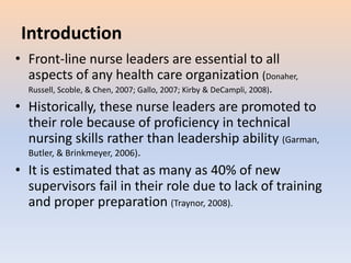 This document discusses leadership in nursing. It begins by explaining that front-line nurse leaders are essential to healthcare organizations but are often promoted due to technical skills rather than leadership abilities. As many as 40% of new supervisors fail due to a lack of training. Historically, nursing has focused on a task-oriented model rather than vision and relationships. The document then introduces the Clinical Leadership Competency Framework, which is built on shared leadership. It describes the five core domains of this framework: demonstrating personal qualities, working with others, managing services, improving services, and setting direction. Specifically, it discusses developing self-awareness, managing yourself, continuing personal development, and acting with integrity under the domain of demonstrating personal qualities.