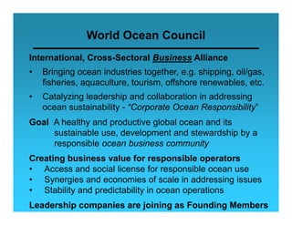 The World Ocean Council is an international, cross-sectoral business alliance that brings together ocean industries to address ocean sustainability through leadership and collaboration. Its goal is a healthy, productive global ocean achieved through responsible use by ocean businesses. The Council works to create business value for responsible operators by facilitating access, synergies in addressing issues, and stability in ocean operations. It also initiates best practices, coordinates engagement in marine planning, and improves ocean science through industry involvement.