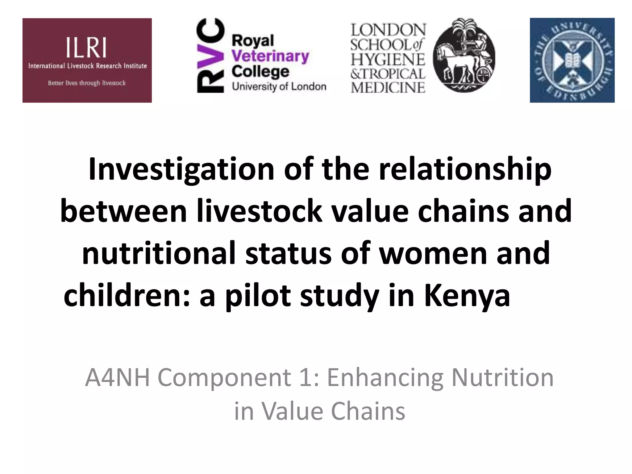 This document outlines a pilot study investigating the relationship between livestock value chains and the nutritional status of women and children in Kenya. The study aims to evaluate the nutritional status and diets of households using different types of livestock value chains. A survey of 200 households in poor areas of Nairobi will assess the nutritional indicators like anthropometrics, diets, and hemoglobin of children and mothers. The value chains used by households for livestock products will also be analyzed. The study hypothesizes that access to livestock value chains is associated with better nutritional status. The objectives are to evaluate diets and nutrition in association with livestock consumption patterns and value chain use. This may help leverage animal source foods for improved nutrition in Kenya.