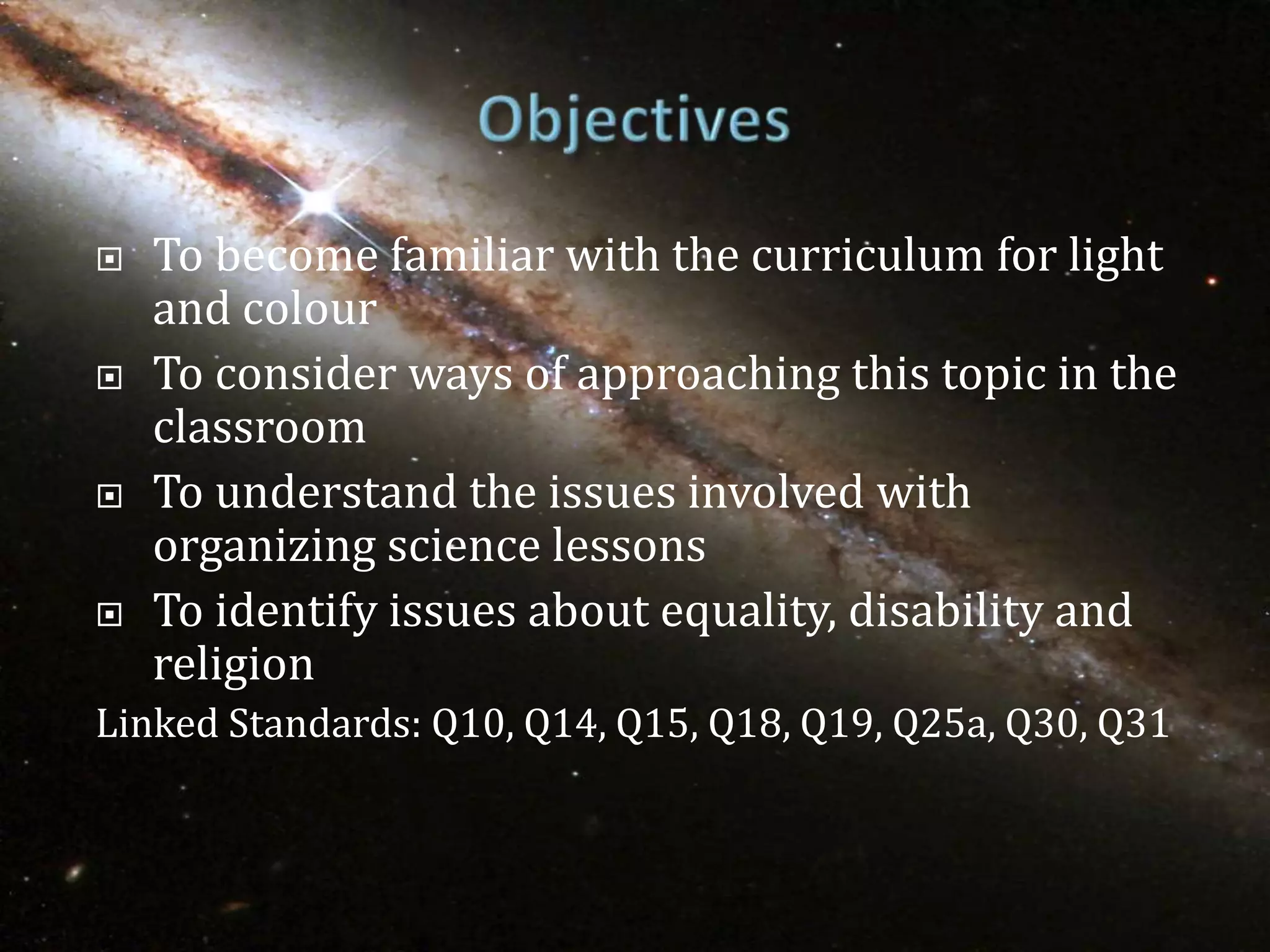 This document provides an overview of concepts and lesson ideas for teaching a unit on light and color. It includes objectives, linked standards, video links and concepts to cover such as light sources, how light travels, reflection, absorption, refraction, shadows, vision, and primary colors. It also discusses organizing science lessons and addressing issues of equality, disability, and religion. Potential student investigations and assignments are outlined.