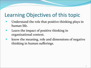 The document discusses positive thinking and its benefits. Positive thinking involves focusing on opportunities rather than difficulties and expecting positive outcomes. It can improve health, help achieve goals, increase happiness and energy. Developing positive thinking involves using positive self-talk, visualizing success, reading inspiring materials, and believing in one's abilities rather than dwelling on negatives.