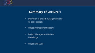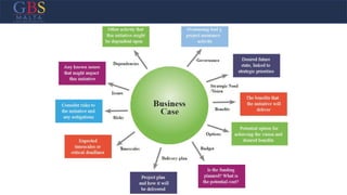 The document outlines the importance of project strategy in project management, emphasizing its role in aligning projects with organizational goals and optimizing resource allocation. It also describes the components of a business case, which is crucial for justifying project investments and ensuring informed decision-making. Finally, it discusses defining project success through various criteria and the necessary tools for measuring and reporting success effectively.