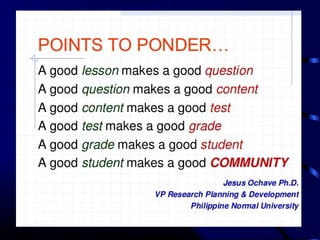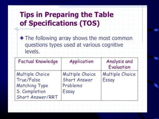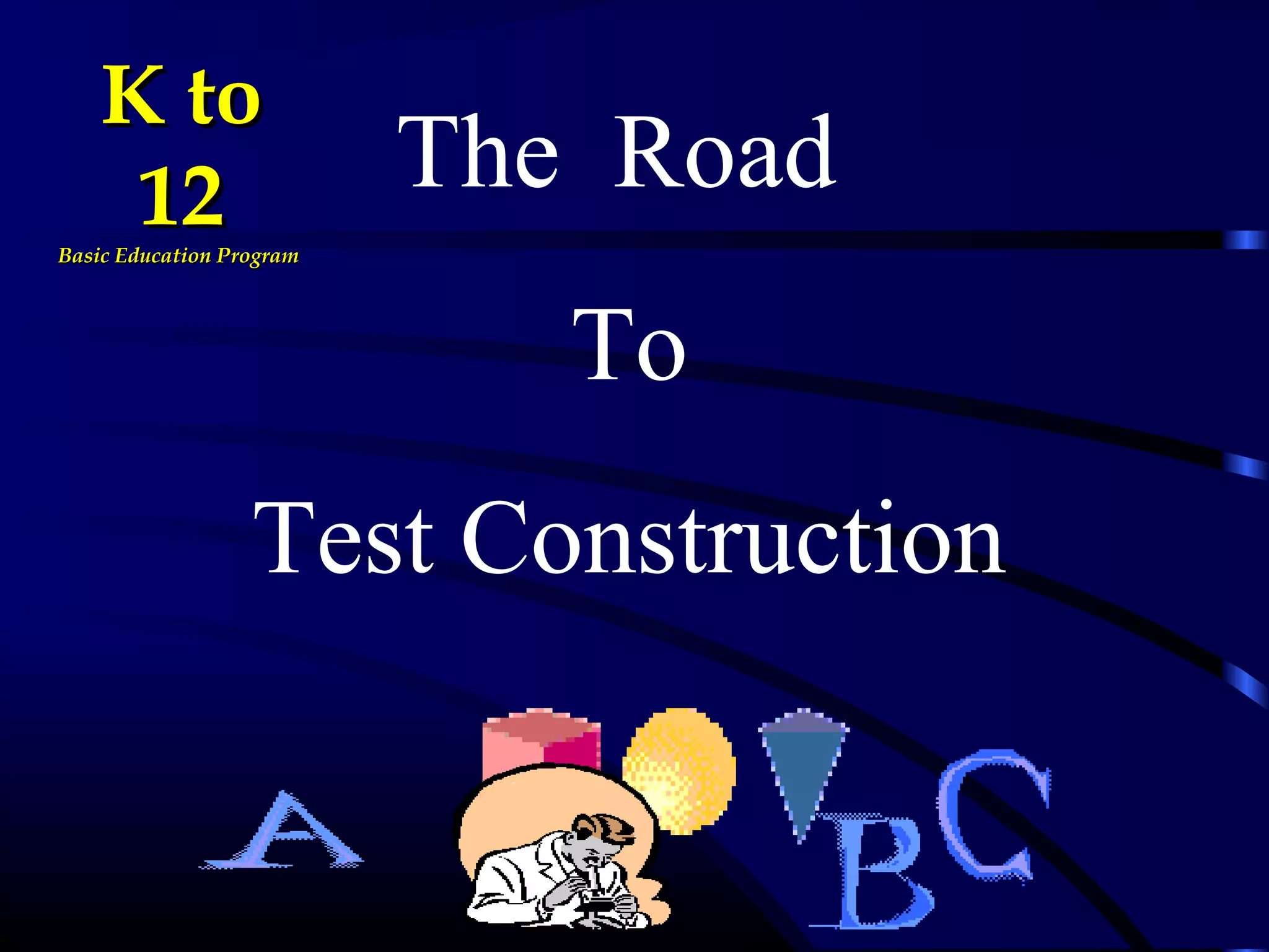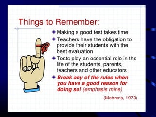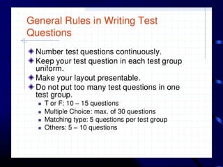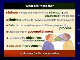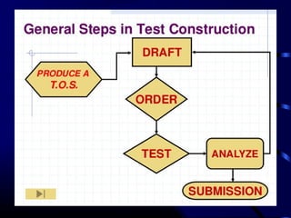 This document provides information and guidance on test construction. It discusses that the purpose of test construction is to improve the educational program and make it more effective. It outlines objectives around identifying cognitive domains of learning and constructing test items. It also discusses Bloom's taxonomy and the six cognitive domains. Various activities are presented to help teachers practice constructing test items aligned to objectives and cognitive domains, including using a table of specifications to plan assessments. The document emphasizes the importance of test construction in evaluating student learning and providing feedback to improve teaching.