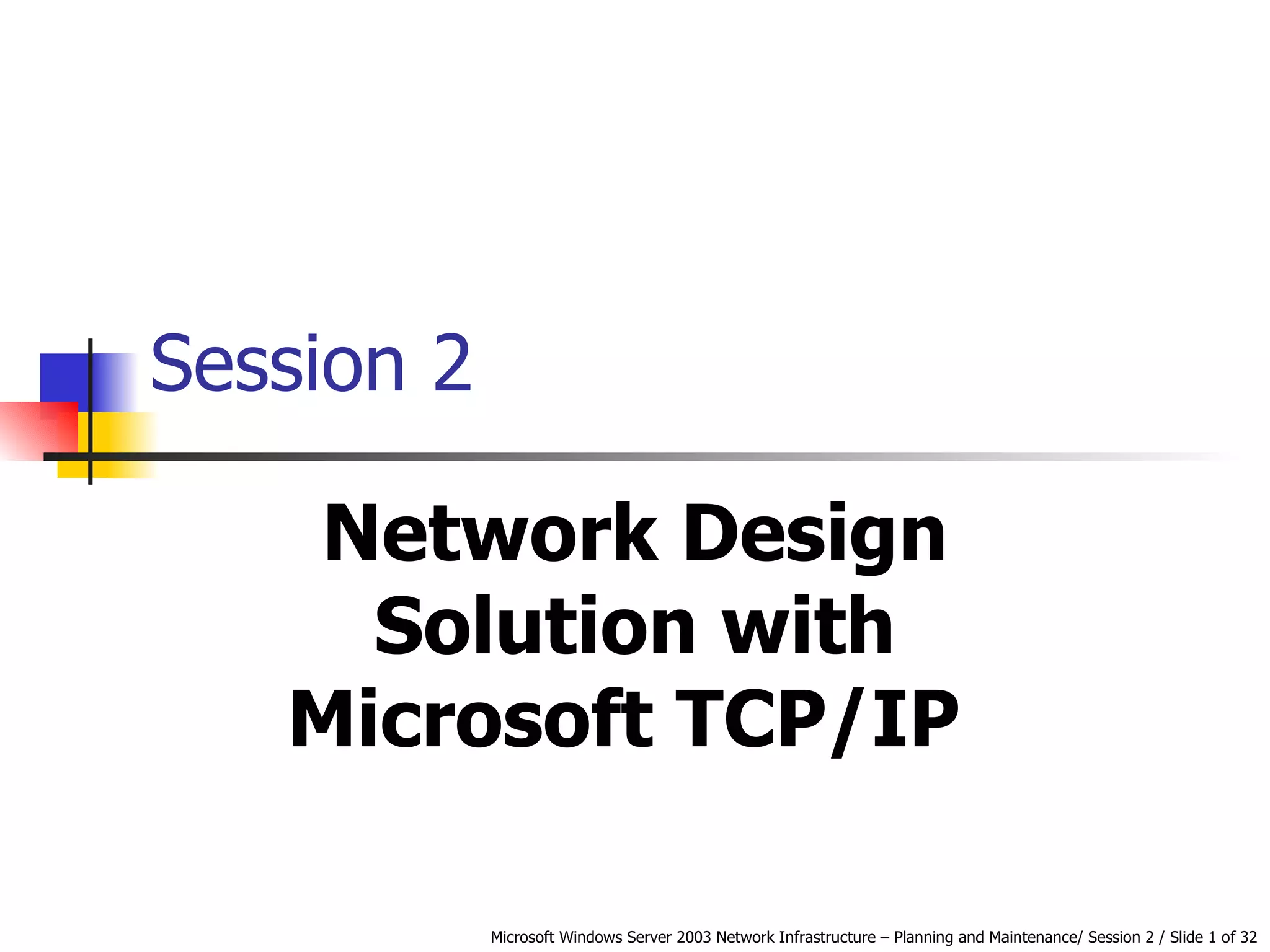 The document discusses network design using TCP/IP. It covers IP addressing, subnet masks, default gateways, and subnetting. It also discusses network security methods like IP packet filtering, encryption, authentication, and IPSec. Optimizing the subnet design, IP performance, remote subnets, and quality of service can create an effective network infrastructure.