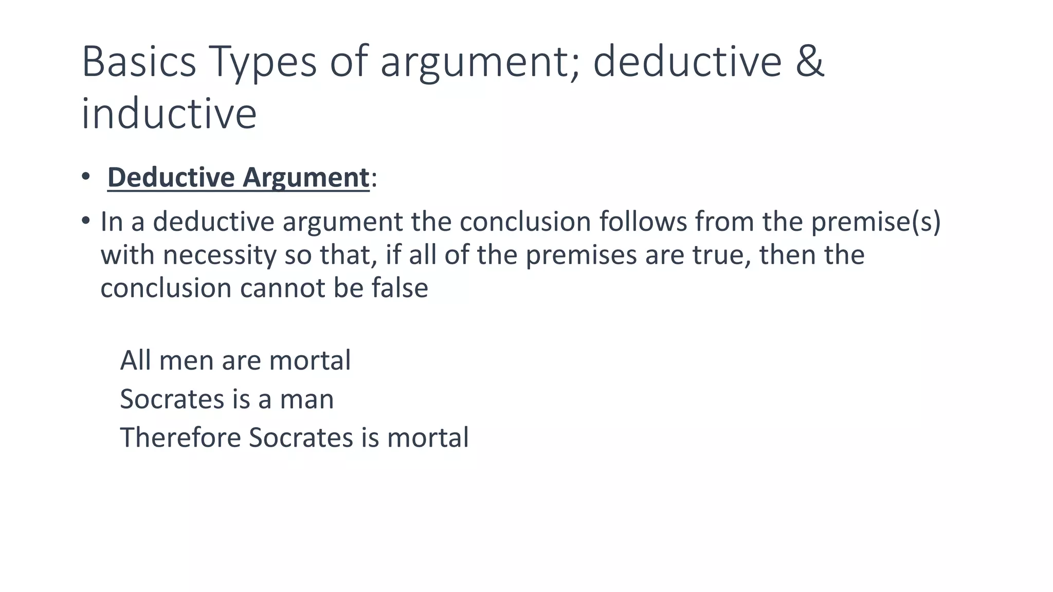 This document discusses two types of arguments: deductive and inductive. It provides examples of each. Deductive arguments have conclusions that necessarily follow from true premises, while inductive arguments have conclusions that are probably but not necessarily true given true premises. The document also evaluates arguments as valid/invalid for deductive and strong/weak for inductive, and discusses how soundness/cogency depends on the truth of the premises.