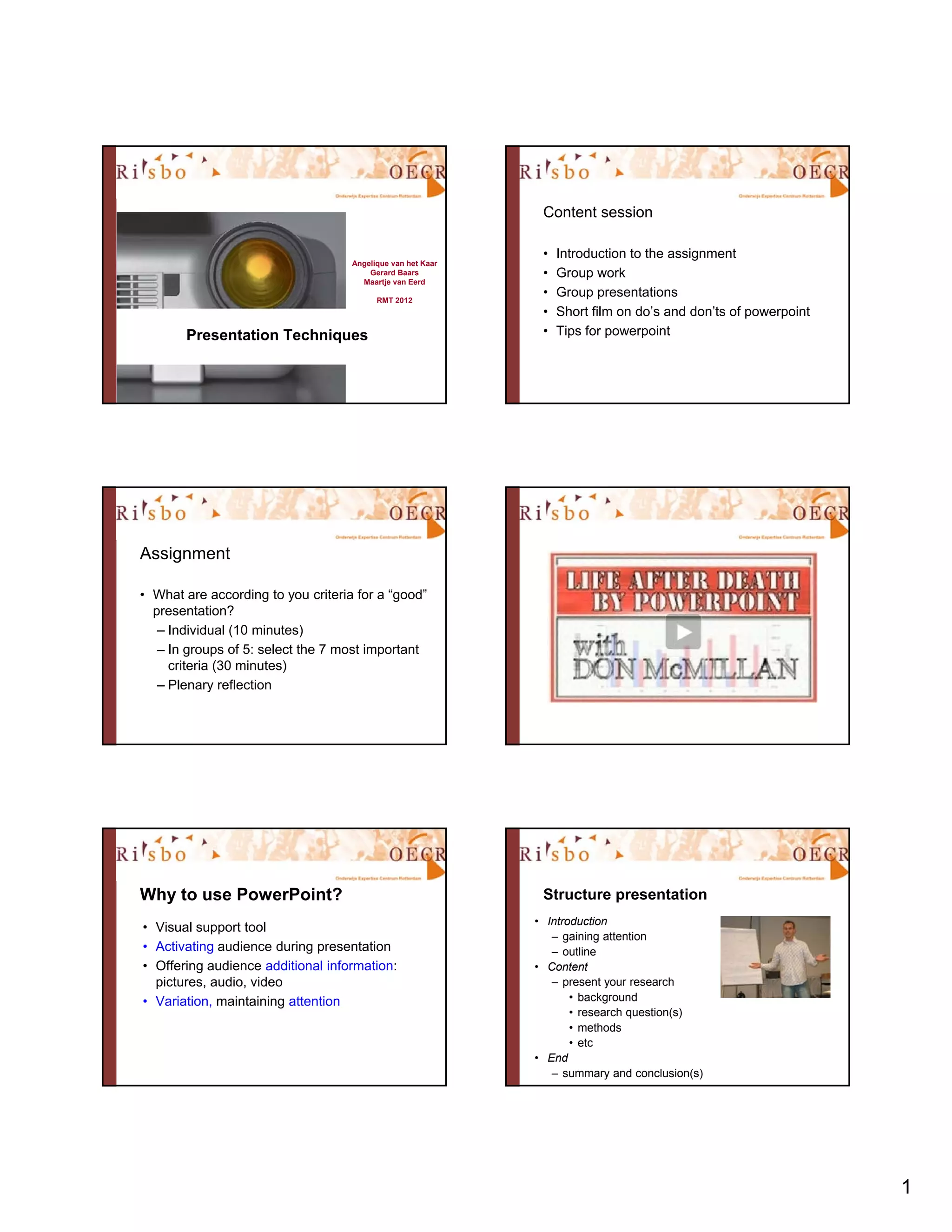 The document provides tips and guidelines for creating and delivering effective PowerPoint presentations. It discusses: