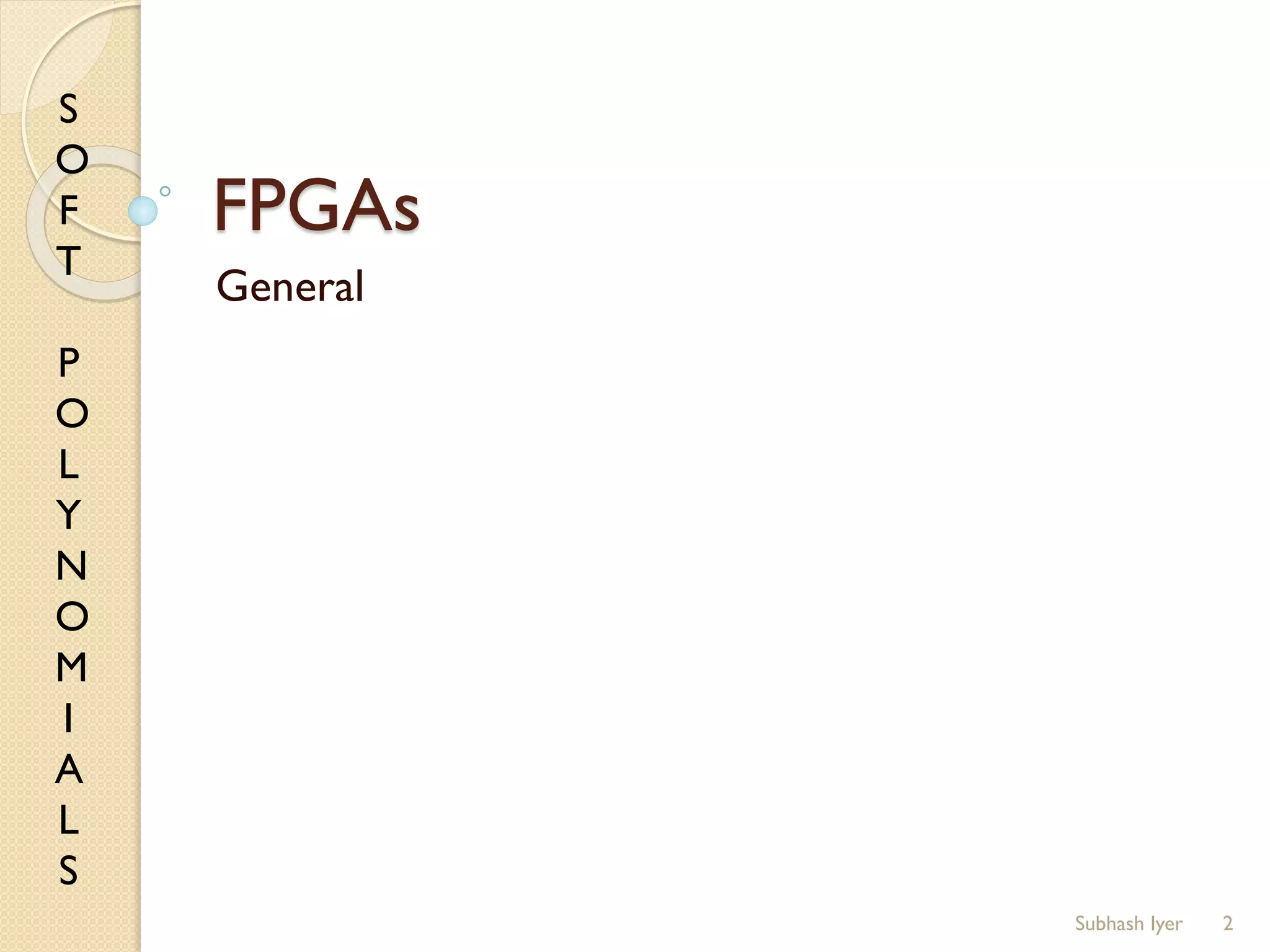 The document discusses the structure and components of field programmable gate arrays (FPGAs). FPGAs consist of programmable logic blocks, interconnects, and input/output blocks. The logic blocks contain lookup tables and flip flops that can be programmed to implement desired logic functions. The interconnects include vertical and horizontal routing channels and switch boxes that allow the logic blocks to be connected as needed. The input/output blocks provide interfaces between the FPGA and external devices.