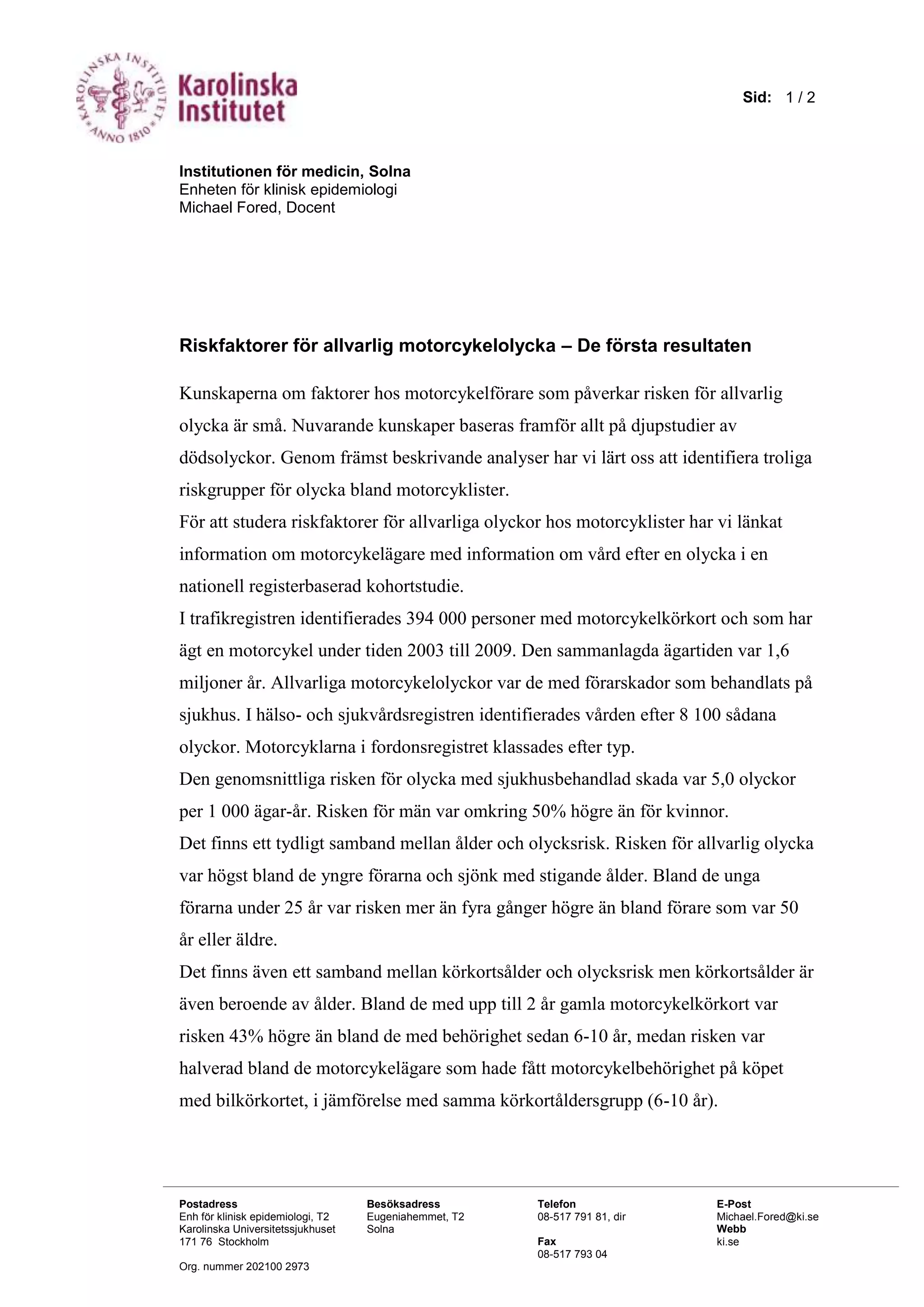 Enh för klinisk epidemiologi, T2 Eugeniahemmet, T2 08-517 791 81, dir Michael.Fored@ki.se