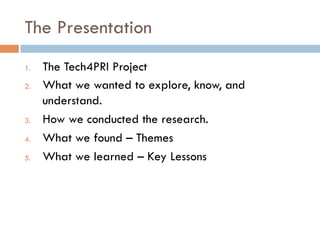 The document outlines the Tech4Pri project, focusing on the relationship between digital technology and citizen participation in local development projects. It highlights key research findings on the challenges and strategies of implementing technologies in projects, emphasizing the importance of a blended approach and the human factor in technology use. Key lessons include the need for clear participatory objectives, understanding the context of technology use, and addressing the digital divide to enhance citizen engagement.