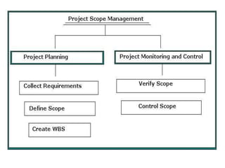 The document discusses project scope management. It provides an overview of the key processes involved, including collecting requirements, defining scope, creating a work breakdown structure (WBS), verifying scope, and controlling scope. It maps these scope processes to the five process groups (initiating, planning, executing, monitoring and controlling, closing) and notes that collecting requirements involves defining and documenting stakeholder needs through techniques like interviews, focus groups, workshops, and prototypes. It also discusses defining the product and project scope, as well as developing a requirements management plan to trace requirements throughout the project life cycle.