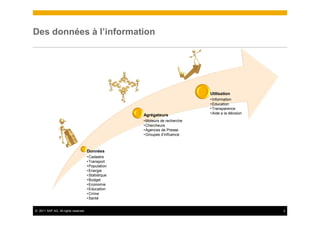 This document discusses open data and the challenges associated with aggregating and using open data from various sources. It notes that open data comes from sources like government records on cadastre, transport, population, energy, statistics, budgets, education, crime, and health. It raises questions about whether the data is updated, whether access could provide economic gains, and whether the honesty of actors can be assumed. It also discusses risks related to the reliability and objectivity of aggregated data from multiple sources used by aggregators. Finally, it presents SAP products that could be used in open data workflows including HANA for rapid data access and ByDesign for mashing up open and internal data.