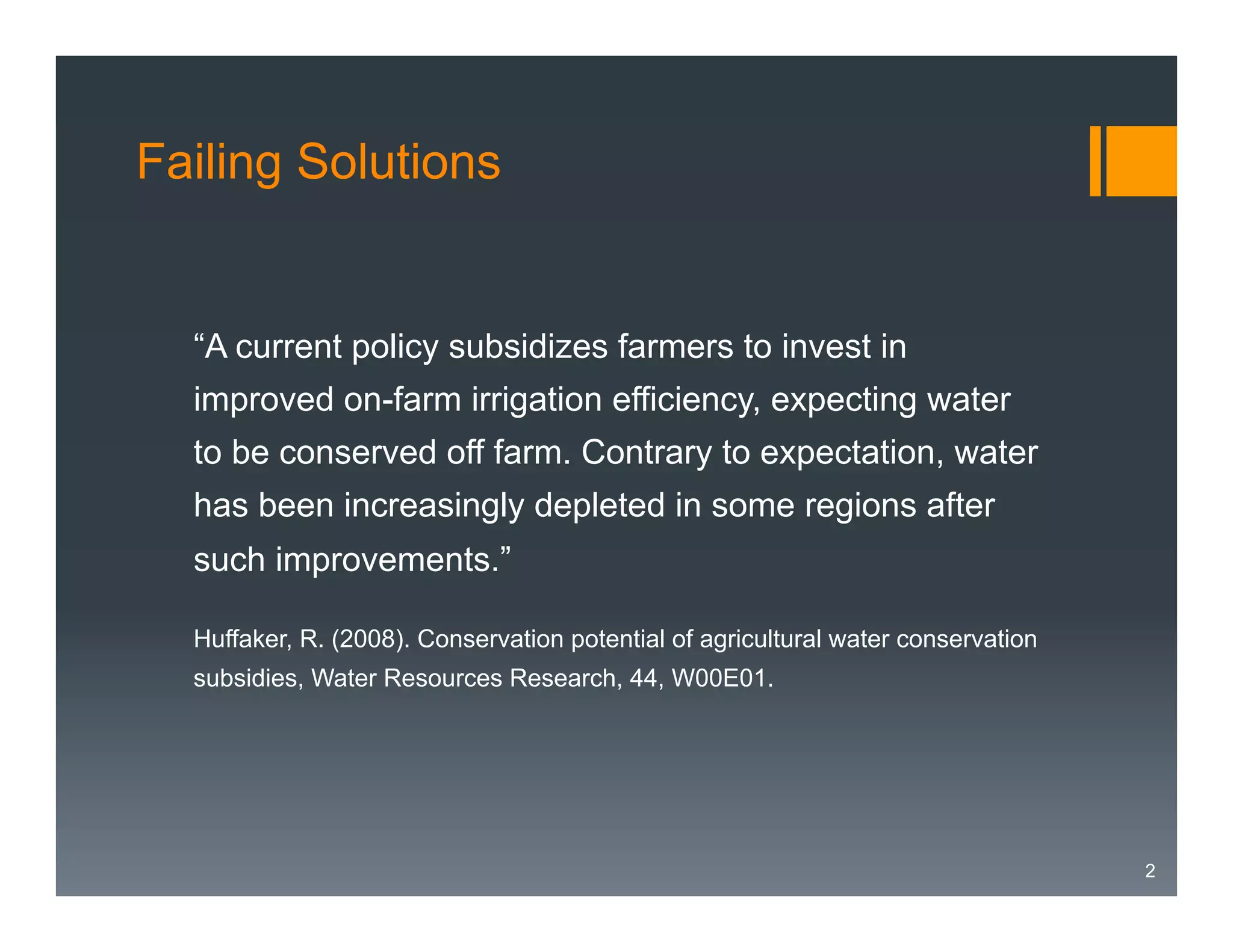 This document discusses the importance of solution-oriented research for developing transformational solutions to water sustainability challenges. It argues that water systems are complex and that professional experience alone is not sufficient, as solutions can fail, have unintended consequences, or be less efficient than possible. It then outlines what solution-oriented research entails, including producing evidence on best practices, sustainable water supply options, effective conservation measures, and more. The rest of the document discusses how to design, test, select, reach agreement on, evaluate, and teach solutions through a problem analysis, goal visioning, strategy design process. It provides examples of intervention points and customized databases to catalog potential solutions. The outlook is that continued solution-oriented research and integrated planning is