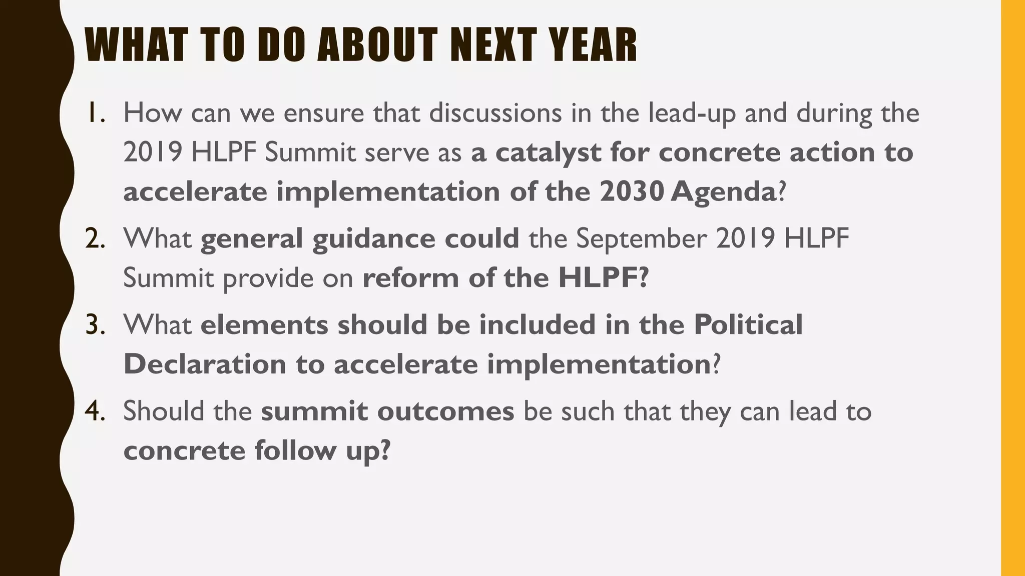 The document discusses potential outcomes from the 2019 United Nations High-level Political Forum on Sustainable Development (HLPF) summit. It suggests that the summit should: (1) link 2019 implementation efforts to the goals for 2020 to accelerate progress on the 2030 Agenda; (2) focus on multi-stakeholder solutions and partnerships to deliver the Sustainable Development Goals; and (3) provide guidance on reforming the HLPF process including setting a new multi-year work program and effectively including preparatory work from other UN bodies and regional commissions. The summit should also adopt a political declaration that addresses financing, governance, capacity building and sustainable development strategies to accelerate SDG implementation through 2030. Summit outcomes need to spur concrete