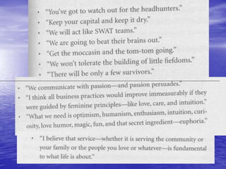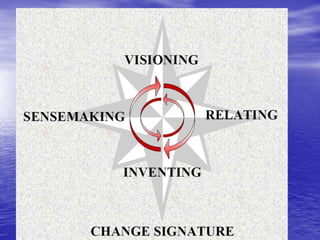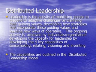 Distributed leadership involves sharing leadership responsibilities across an organization. It focuses on developing leadership capabilities in all people rather than designating a single leader. The key capabilities include sensemaking, relating, visioning, and inventing. Sensemaking involves interpreting information to develop understanding of challenges. It is an iterative social process focused on cues and plausibility over accuracy. Distributed leadership relies on many people in an organization engaging in sensemaking to recognize issues and opportunities in a dynamic environment.