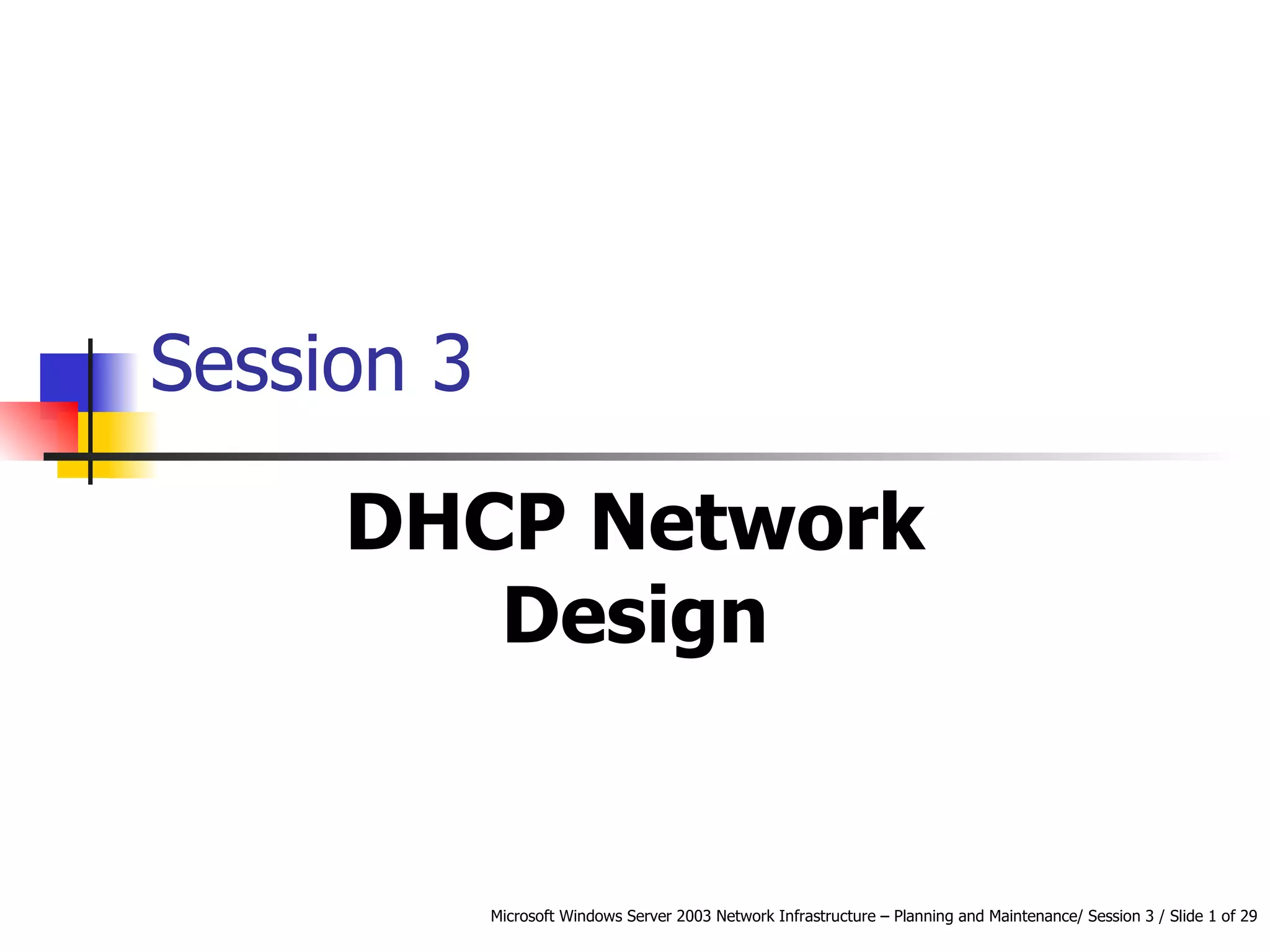 DHCP automates the allocation of IP addresses, subnet masks, default gateways, and other network configuration parameters. It uses four messages - DHCPDISCOVER, DHCPOFFER, DHCPREQUEST, DHCPACK - to allocate addresses dynamically or statically. DHCP can be designed for LANs, routed networks, and non-Microsoft clients. It enhances availability through features like superscopes across multiple servers and Windows Server 2003 clustering. Security involves authorizing servers, controlling access, and using firewalls. Performance is increased by shortening response times, distributing load across servers, and optimizing lease times.