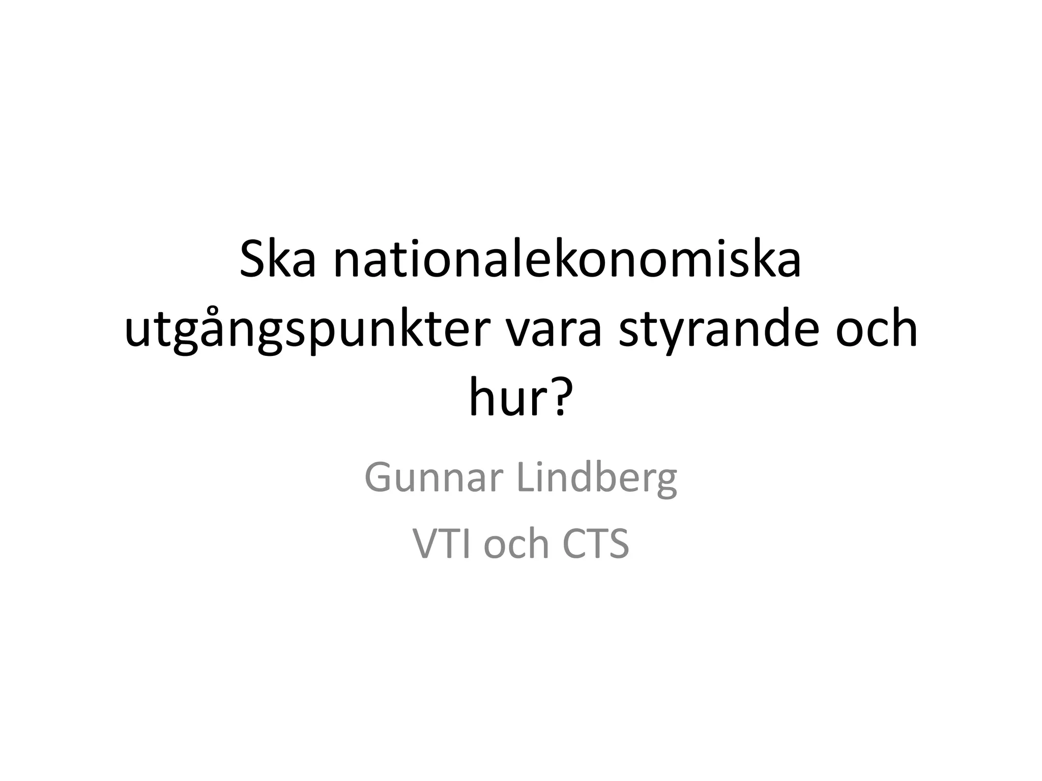 Utgångspunkt och innehållInfrastrukturpolitikpå samhällsekonomisk grund (VTI Rapport 654)Remissvar på ”Preliminärt förslag till nytt planeringssystem för transportsystemet”Innehåll1. Nationalekonomins grund2. Transportinfrastruktursektorns ”problem”3. Samhällsekonomiska kalkylen4. Nationell eller regional5.Uppföljning och utvärdering6. Sammanfattning