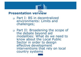 The presentation by Jorge Rodriguez Bilbao focuses on the integration of local governments into budget support programs, highlighting limitations and challenges in decentralized environments. It emphasizes the need for a comprehensive understanding of the local public sector to design effective development interventions, outlining key considerations for budget support and decentralization. The document stresses the importance of adapting aid modalities to enhance citizen engagement and improve service delivery at local levels.
