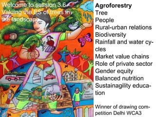 This document discusses agroforestry and trees in the landscape. It mentions topics like people, rural-urban relations, biodiversity, water cycles, markets, the private sector, gender equity, nutrition, education, and a drawing competition winner. The document welcomes attendees to a session about valuing ecosystem services of trees.
