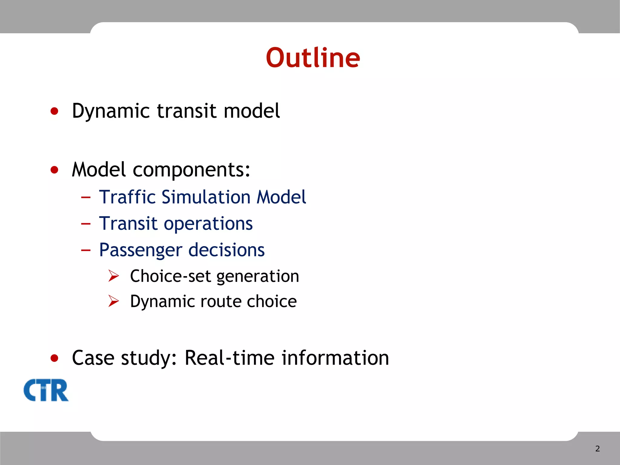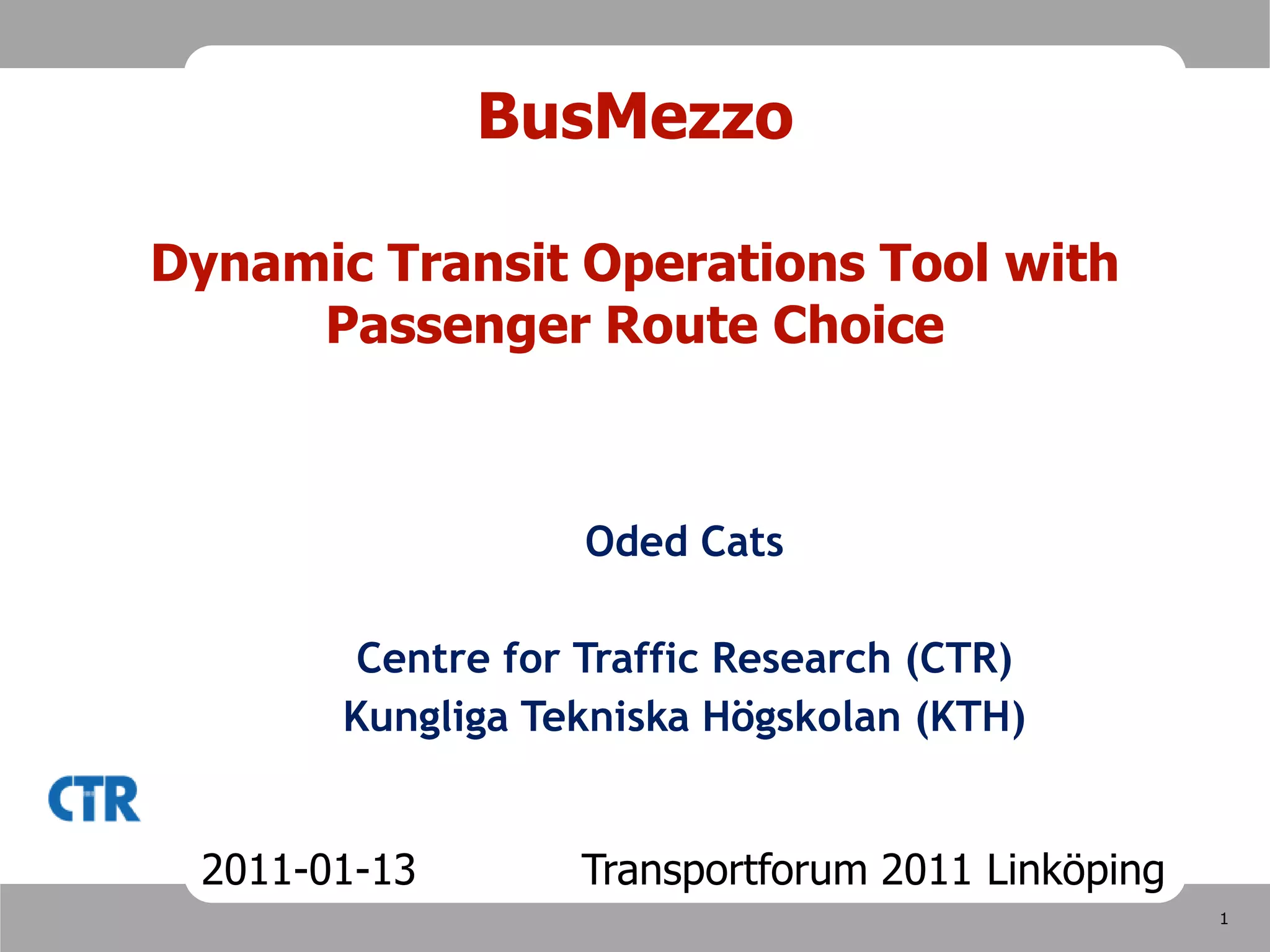 This document outlines BusMezzoDynamic, a dynamic transit modeling tool that simulates traffic conditions, transit operations, and passenger route choices. The model has several components: (1) a mesoscopic traffic simulation, (2) modeling of transit operations and uncertainties, and (3) modeling of passenger demand and dynamic route choices. It is intended to evaluate impacts of transit operations strategies and real-time traveler information provision. A case study of the Stockholm metro system demonstrates how the model can simulate passenger route choices and travel times under normal operations and service disruptions with and without real-time information. Ongoing work aims to further develop transit operations strategies and the passenger choice-set generation model.