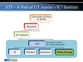 The document provides information about the Austin Technology Incubator (ATI), a clean energy incubator located in Austin, Texas. ATI assists early-stage technology companies in areas like clean energy, bioscience, IT, and wireless. It provides companies with access to talent, capital, networking opportunities, and strategic guidance. ATI has supported over 350 companies since 1989, helping raise over $900 million in capital and creating thousands of jobs. Current membership offers various levels of support and resources to companies.