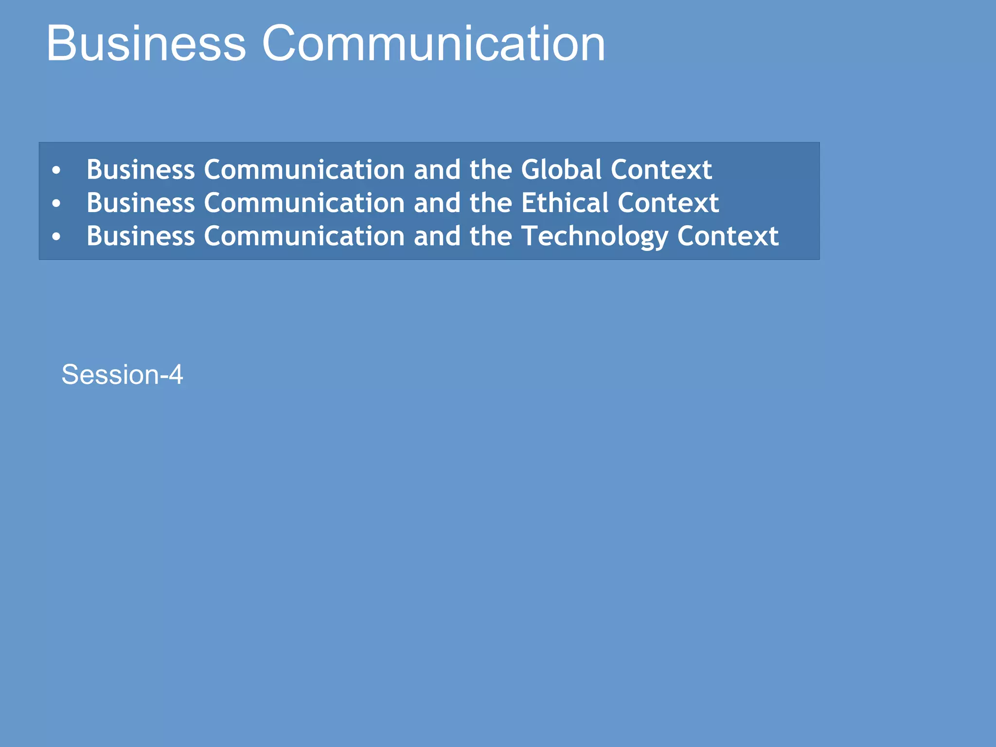 This document provides an overview of business communication in the global, ethical, and technological contexts. It discusses how culture, ethics, laws, and technology impact business communication. In terms of culture, it examines high-context vs low-context communication styles and how national and individual cultural variables can influence communication. Regarding ethics, it outlines how personal ethics, organizational values, and laws guide business decisions and interactions. Finally, it reviews various technologies used for internal and external communication, such as email, voice mail, teleconferences, and databases. The document aims to increase understanding of business communication across different societies, value systems, and technological platforms.