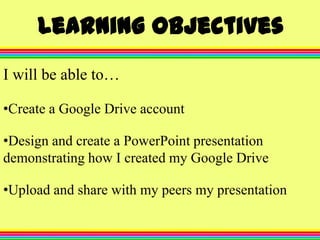 This document provides instructions for creating a Google Drive account and making a PowerPoint presentation to demonstrate the process. Learners will create a Google Drive account, design a PowerPoint presentation showing the steps, and upload and share the presentation with peers. The presentation should include clear screenshots and explanations of each step taken to help others set up their own Google Drive accounts. Upon completing the task and presentation, learners are asked to post in a discussion forum on the learning platform.