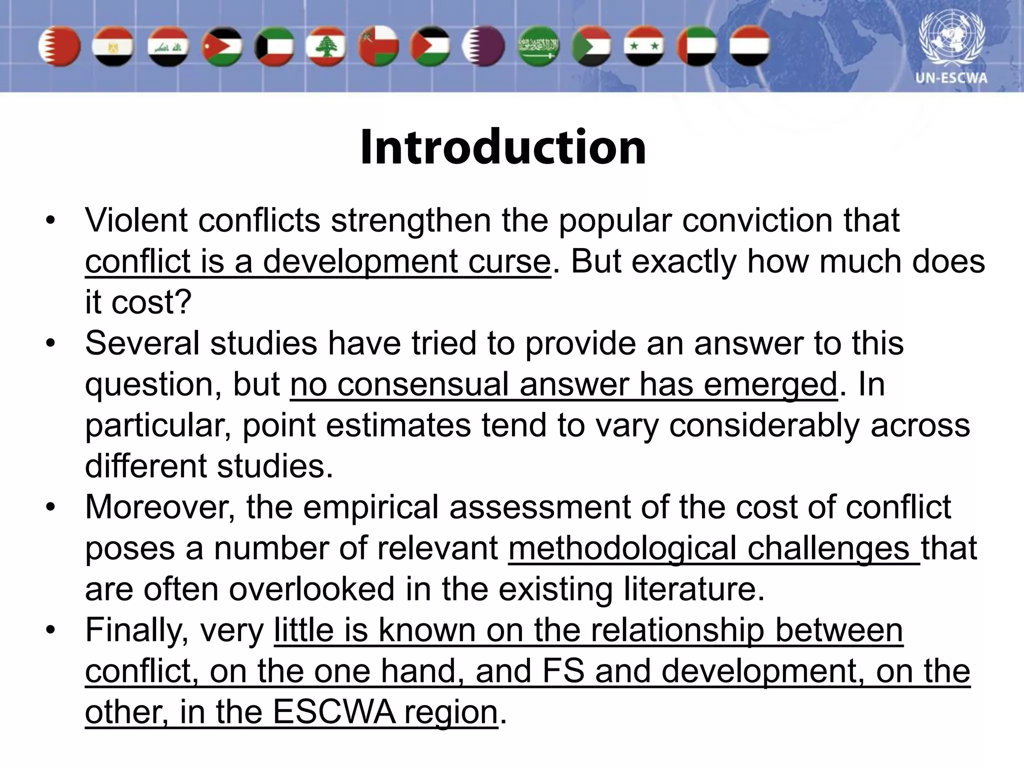 The document discusses the costs of conflict on development and food security. It finds that civil wars reduce GDP growth by about 0.6% per year of conflict, while interstate wars have less impact. Conflict weakens institutions, reduces trade and investment, and harms social development indicators like education and health. Post-conflict countries face challenges providing services due to weak governance and fragmented aid approaches that risk aid dependence. Military spending in post-conflict nations may crowd out social spending.