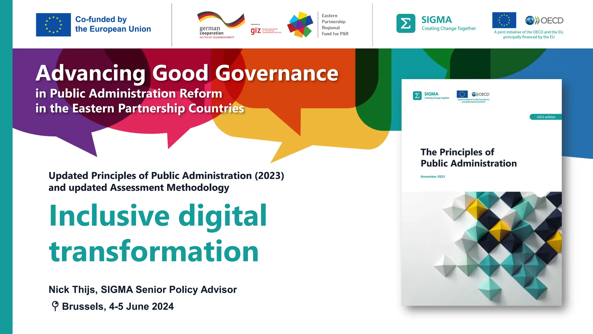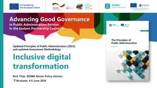 This document outlines a joint OECD and EU initiative focused on public administration reform in Eastern Partnership countries, emphasizing updated principles and methodologies for inclusive digital transformation. Key thematic areas include policy development, public service management, financial management, and user-centric service delivery. The initiative aims to enhance governance and service accessibility while addressing digital inclusion and cybersecurity concerns.