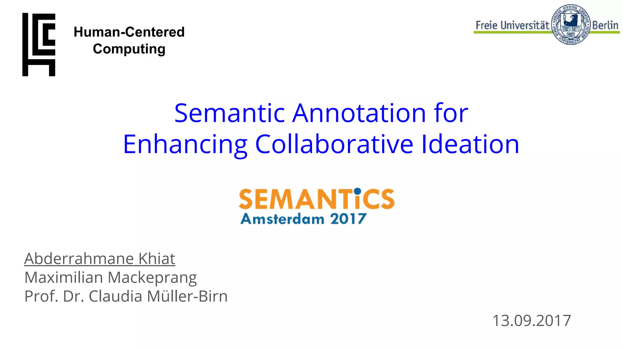 This document discusses enhancing collaborative ideation through semantic annotation. It notes that some collaborative innovation platforms have attracted thousands or tens of thousands of contributors. The document proposes getting inspiration through creative, diverse ideas and finding similarities between ideas. It provides an example of matching two ideas - a heat-sensitive window that lights up in a fire, and a facade that indicates which floor needs rescue - by annotating them with semantic tags like "window" and "facade". The goal is to convert a similarity matrix into a 2D visualization to illustrate the solution space for ideas.