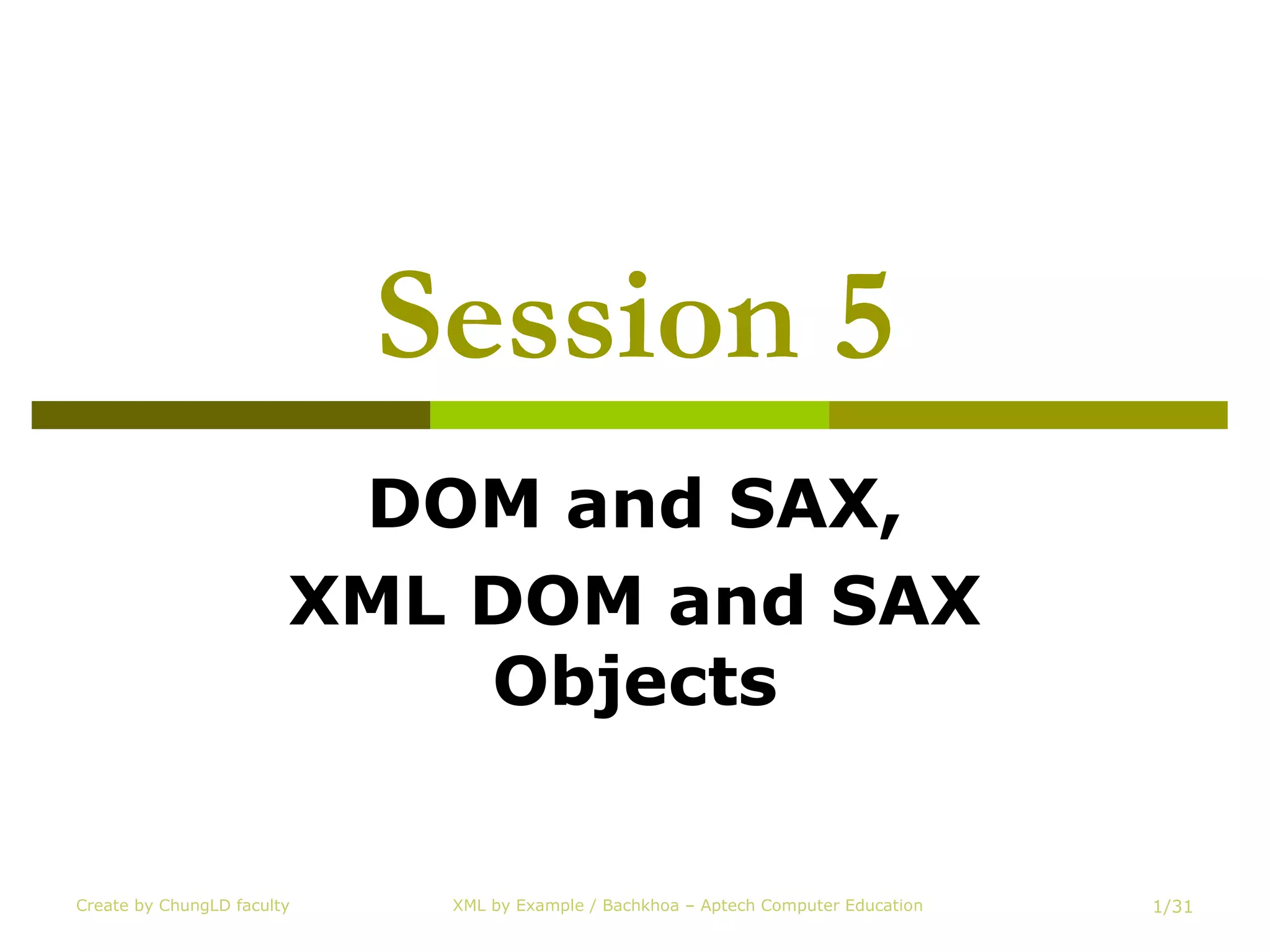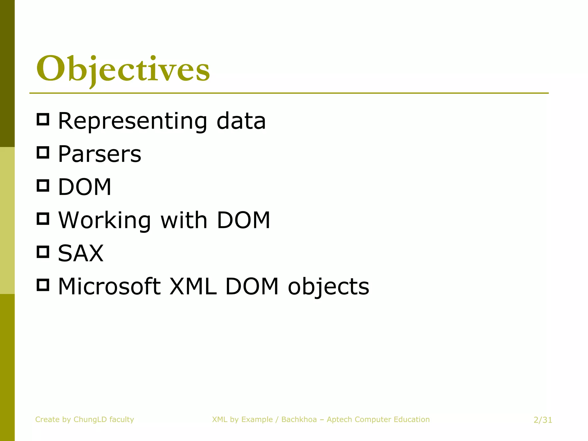 This document summarizes XML parsing techniques including DOM, SAX, and Microsoft XML DOM objects. DOM builds a hierarchical model of the XML document as a tree structure in memory. SAX is event-based and parses the document sequentially, triggering events. Microsoft XML DOM provides classes that map to the W3C DOM standard for manipulating XML documents. The document compares DOM and SAX, describing their advantages and disadvantages. It also outlines common DOM objects and their properties and methods for traversing and manipulating the XML document tree.