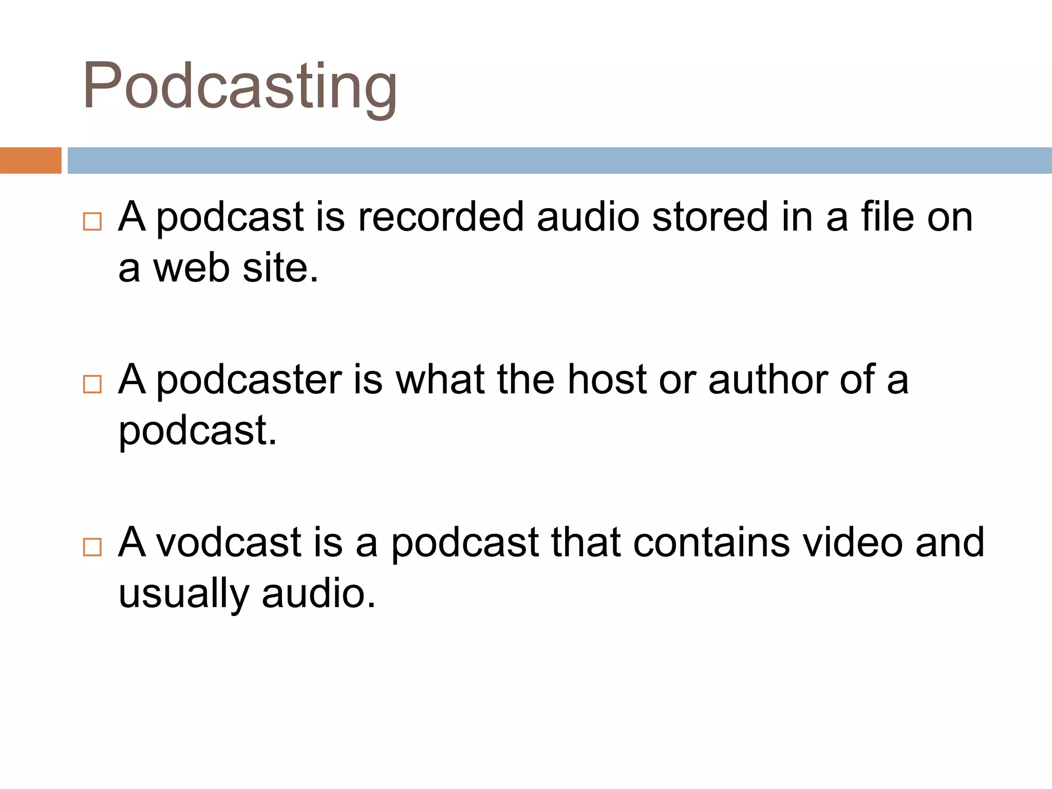 Podcasting involves creating recorded audio or video files that are published on the internet and can be automatically downloaded by subscribers through feed formats like RSS or Atom. Podcasts are typically created by students to share with classmates, by teachers to provide resources for students, or by educational institutions to offer materials for teachers and learners. Common tools used for making podcasts include Audacity, Movie Maker, Garage Band, iMovie, and Photo Story.