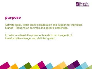 2. The group mapped out their current sustainability initiatives and explored how collaborating could increase their impact. They discussed trends like increasing income inequality, the rise of digital technologies, and the sharing economy.
