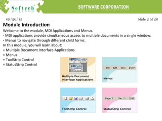 This document provides an overview of MDI (Multiple Document Interface) applications and menus in Windows Forms. It discusses how MDI applications allow multiple child forms to be opened within a single parent form window. It also describes the different types of menus (main and context), how to create menus using controls like MenuStrip, ToolStripMenuItem and ContextMenuStrip, and other controls like ToolStrip and StatusStrip.