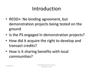 The document discusses issues around private sector engagement in REDD+ projects, including opportunities and challenges. It summarizes a database of 115 REDD+ demonstration projects around the world. Key points include: